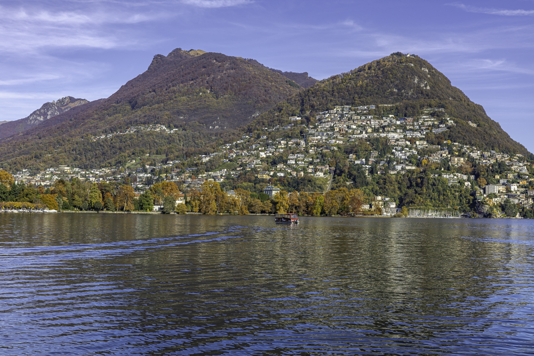 Lugano in autumn presents a tranquil charm, with the lake reflecting vibrant fall colors and mountains enveloping the city, as it prepares for the festive illumination of Christmas lights.